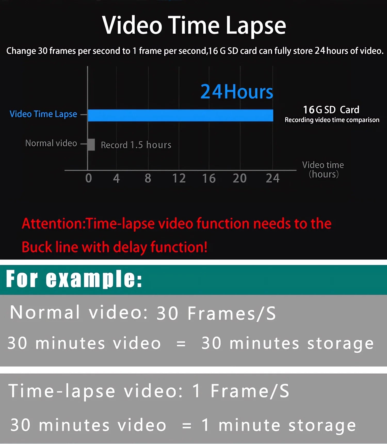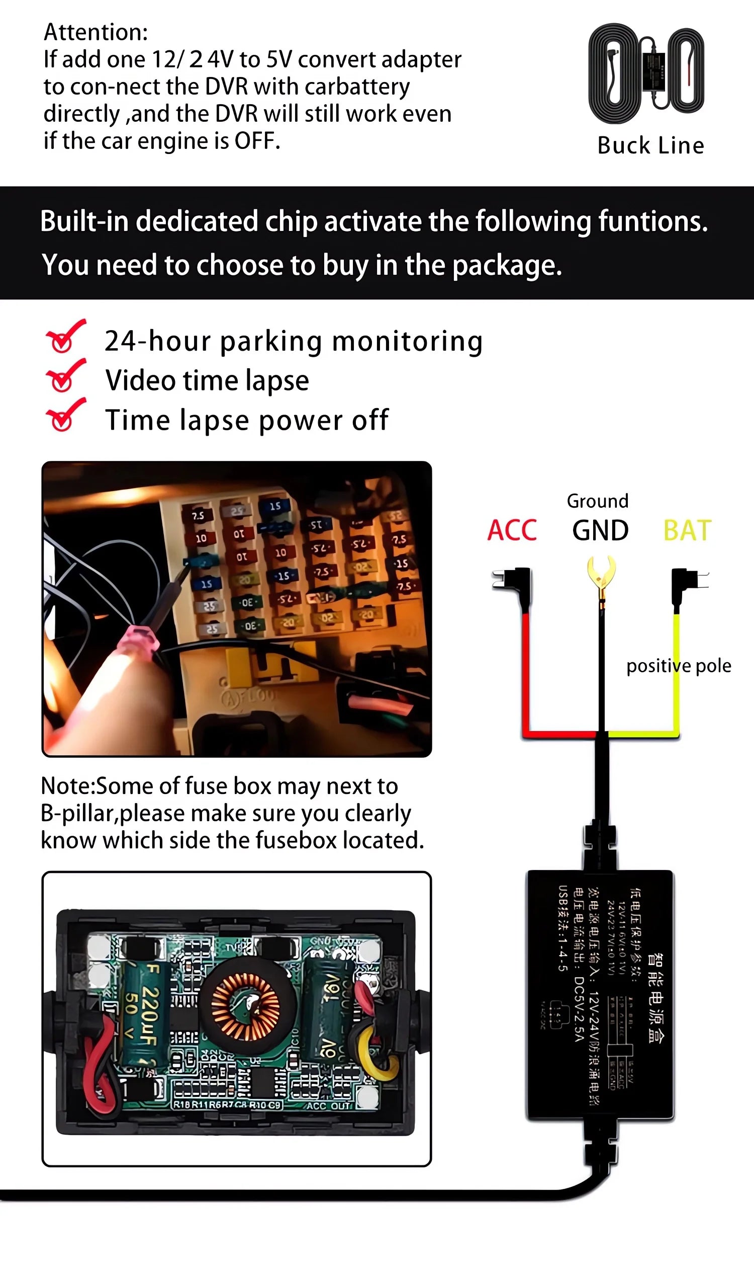 If you need the 24 hour parking monitoring function, you can order the corresponding Buck Line accessories to replace the car charger.Through Buck Line, the DVR power can be obtained directly from the car battery or car ACC, so that the DVR can maintain normal recording work even when the car is turned off.(Since different car models have different battery interfaces or ACC interfaces, it is not recommended to install it by yourself. It is recommended to find a professional to install the Buck Line.)