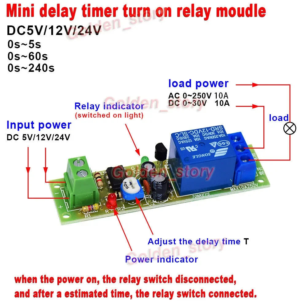 Product DescriptionFunction introduction: The time delay relay module adopts NE555 as the time base. Function: connect power supply to module, the relay switch disconnected,