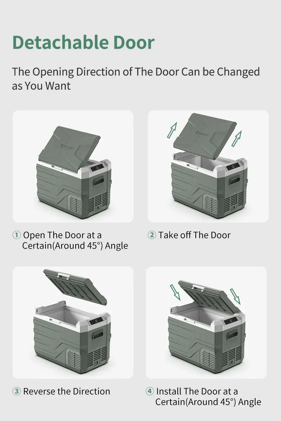 Equipped with a reversible door, which you can install the door on the other side to meet your needs. Built-in interior LED lights for easy using at night. Drain hole in the bottom of the electric cooler makes it convenient to clean. With durable latch and sturdy handle for easy opening and lifting. These thoughtful designs ensure a stable operation of the refrigerator in various scenarios.