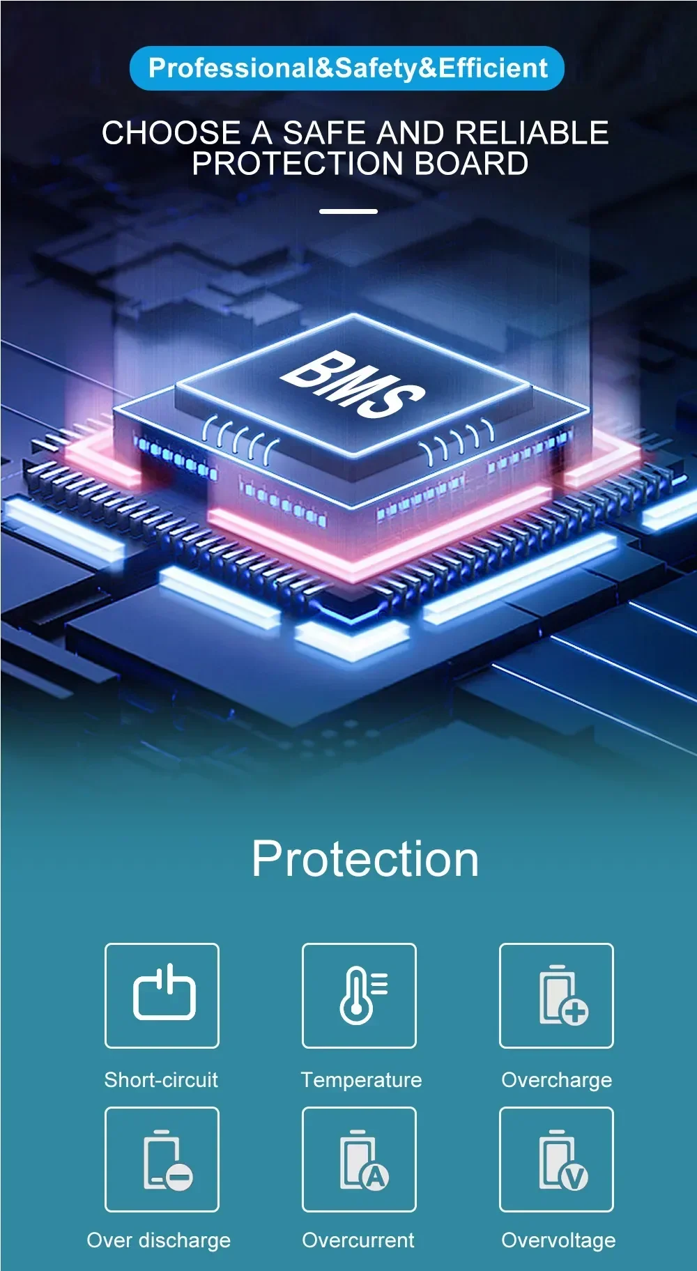 4. Built-in BMS chip prevents the battery from overcharging, overcharging, overcurrent, overheating, short circuit