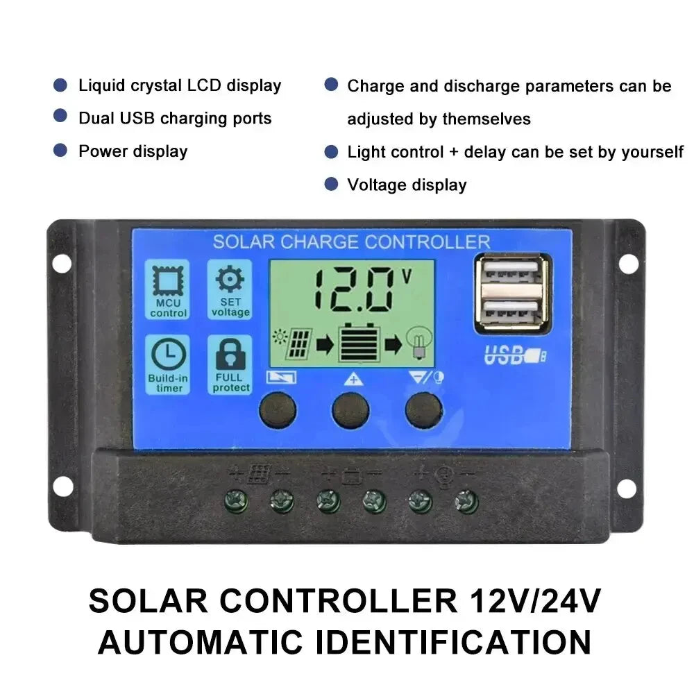 Solar Charge Controller 12V/24V 30A/20A/10A Auto LCD Dual USB 5V Output Photovoltaic Panel Regulator Load Discharger for Renewable Energy Systems