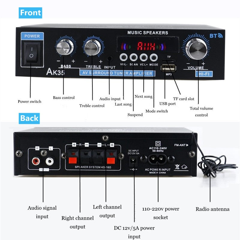 Stereo Amplifier 2 Channel Bluetooth 5.0 Surround Sound FM, USB, Remote Control