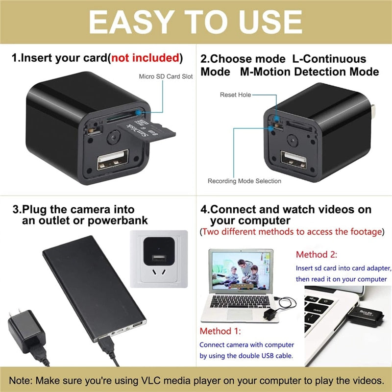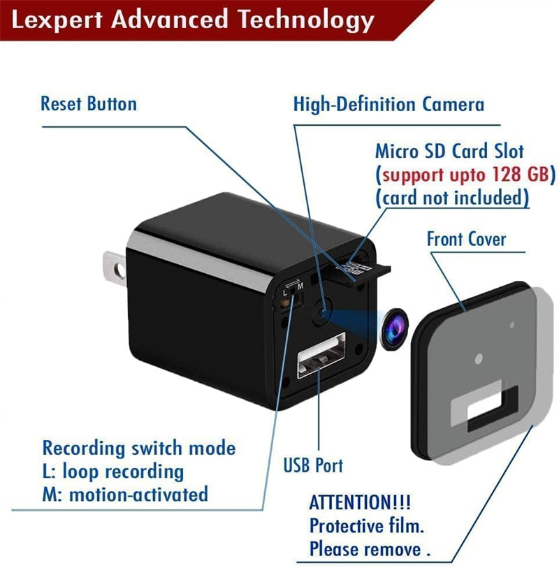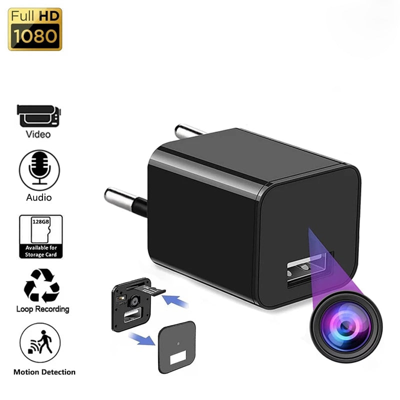 USB Charger DC 5V Adapter Mini Camera HD 1080P USB Wall Charger Micro Camera Auto Video SD Card Loop Recording(No WiFi)